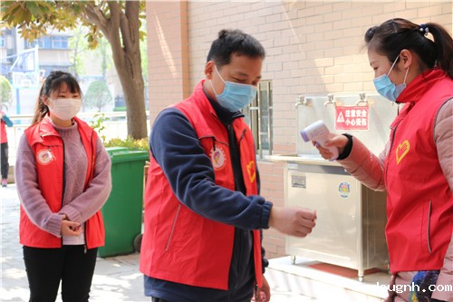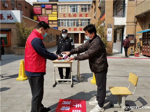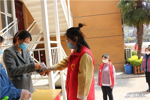 每个教室门口放置了非接触洗手器,任课老师协助班主任对学生进行体温检测并记录在册,体温正常的学生手部消毒后进入教室。