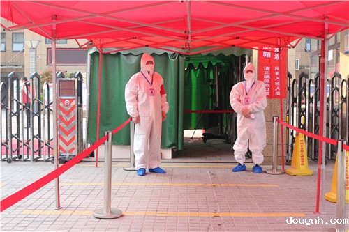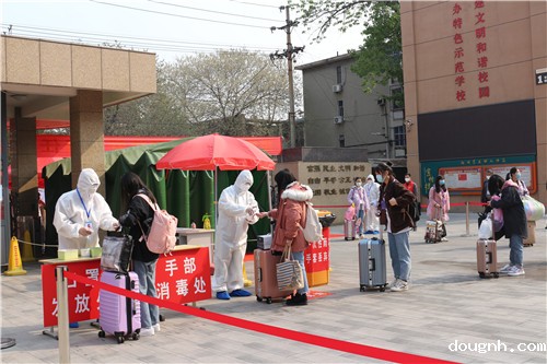 根据学校高三复学方案,4月7日上午9点整,高三年级各班班主任已经穿好防护服在布厂街口等待同学们的到来。作为当天第一批报道的学生,音三一班的同学们集合完毕之后,在班主任胡金丽老师的带领下,按照前期分好的名单,6人1小组,保持安全距离排队步行来到校门口,等待测温入校。