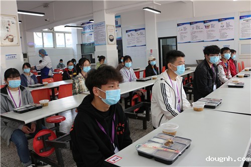 11点35分,经过排队、测温后学生进入食堂,洗手后到指定位置就座。在同学们入座之前,餐厅工作人员已经将用一次性饭盒分装好的午餐摆放到位。每天每餐除了有学校固定的值班干部陪餐、巡查食堂之外,管城区食药局派驻学校的食品安全监督员疫情期间也将在学校全程监督食堂工作。