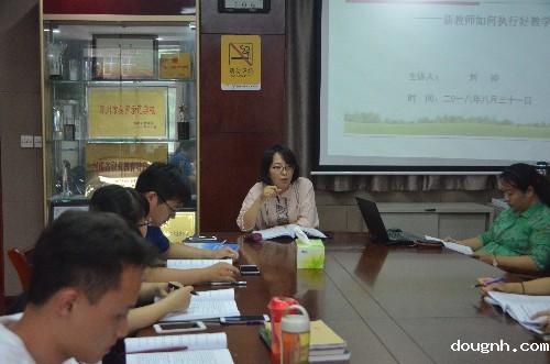 首先,办公室副主任何冰艳组织大家学习了郑州市艺术工程学校《规章制度汇编》、《教职工请假制度(试行)》、《教师职业道德行为准则》等教师管理制度,希望新教师能够严格要求自己,以德为先,自觉遵守各项规章制度,以制度正自身,以自身之正为学生树立榜样。教务处副主任刘婷就课改推进情况作了简单介绍,结合一些案例重点阐述了新教师在教学中如何结合信息化手段,提升授课质量,并向名师迈进。