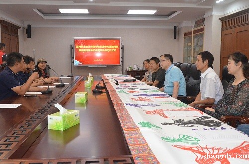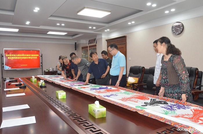 6月20日下午,郑州文化馆非遗中心主任赵利涛、副主任马静、“听爷爷讲故事.非遗援助计划”发起人.市非遗中心副主任马守国、“剪纸花.民族情”组委会成员及郑州市非遗剪纸传承人杨征和文化馆志愿者一行来到18新利app,他们是受中华人民共和国第十一届少数民族传统体育运动会执委会的委托,向18新利app颁发传统文化进校园“非遗传习基地”牌匾以及我校承接“剪纸花.民族情”向全国民运会献礼的剪纸长卷项目的交付工作的。