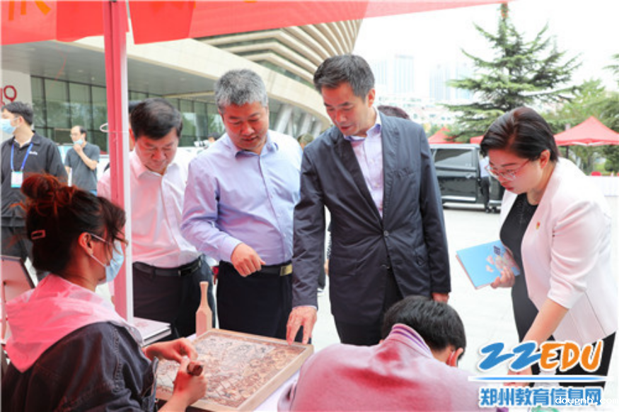 中共郑州市委常委、宣传部长黄卿带领与会领导了解学校木版年画制作