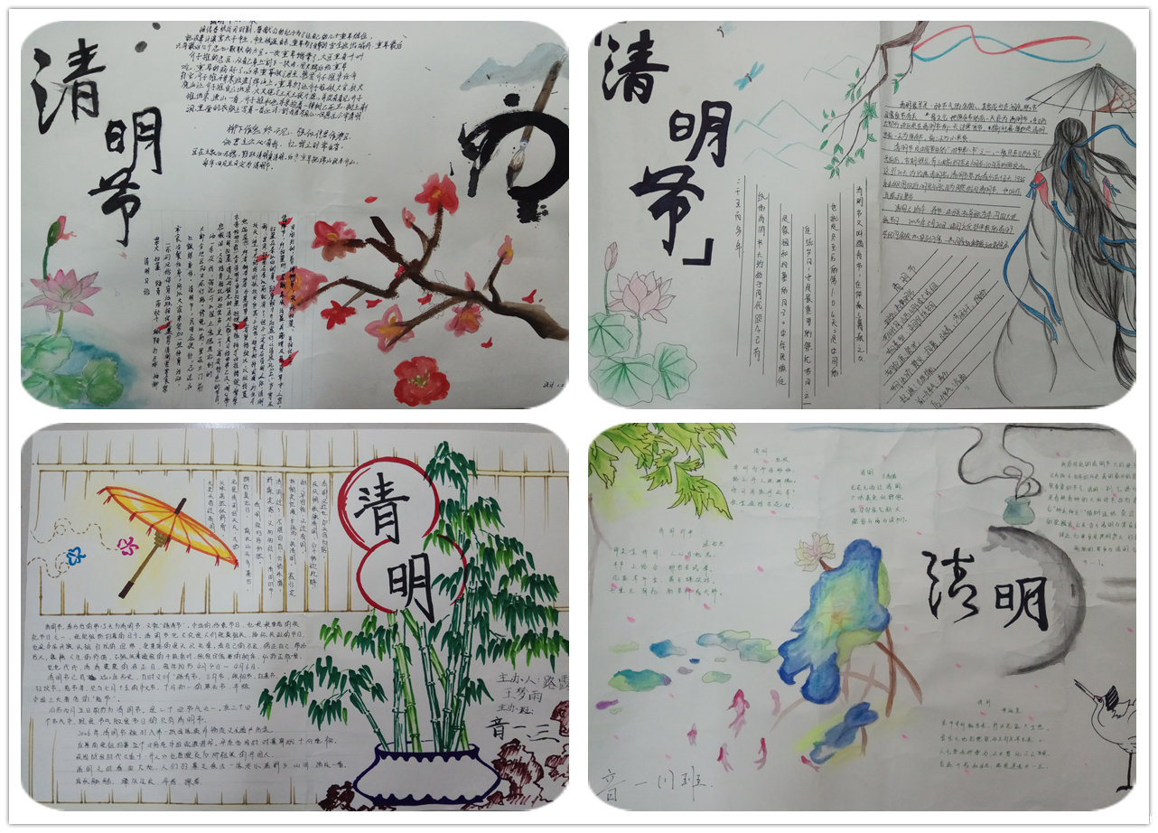 随后,各班积极、多种形式地围绕“清明节—缅怀先烈”开展主题班会和手抄报活动。活动内容丰富,有普及清明节的相关知识,如清明节的由来、清明节的习俗、清明节的古诗等等;也有以缅怀先烈为主题的。很好的诠释了有关清明节的中华传统文化,加强了民族传统节日的宣传。