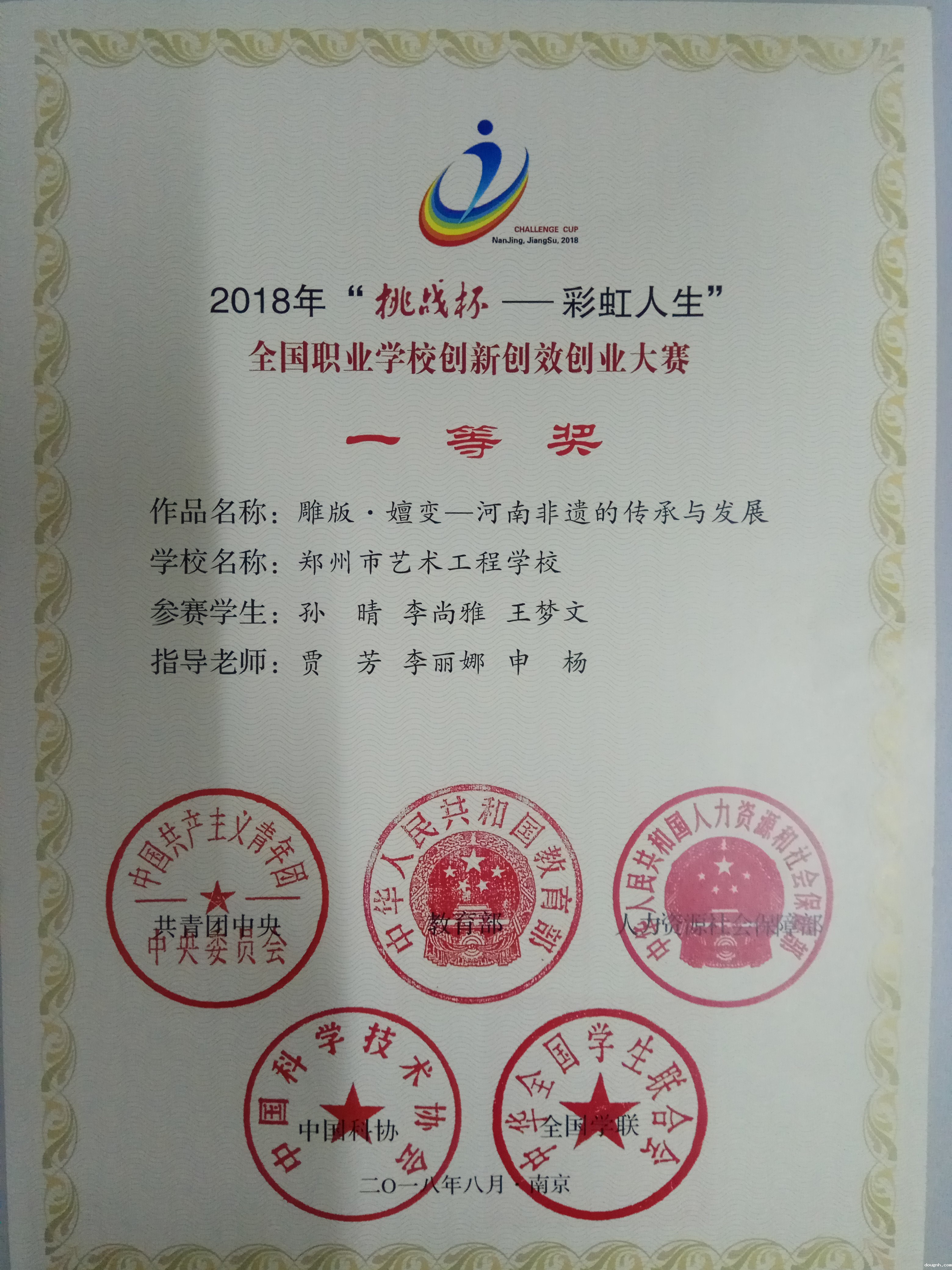 8月14日—8月17日,由共青团中央、教育部、人力资源和社会保障部、中国科协、全国学联、江苏省人民政府主办的2018年“挑战杯——彩虹人生”全国职业学校创新创效创业大赛决赛在南京举行。郑州市艺术工程学校贾芳、李丽娜、申杨老师辅导的《雕版·嬗变——河南非遗的传承与发展》,王艳芬、孟建军、武亚红老师辅导的《和园——田园群居养老乐园》参赛项目经过省赛、全国复赛后入围本次终审决赛,最终分别荣获全国一等奖、三等奖。