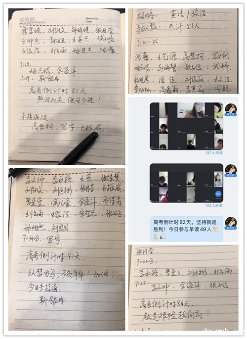 7:15发起视频会议,小组长点名,汇报组内成员到达情况,7:20开始早读,记录学生早读情况,对于迟到学生,及时电话督促。8:00结束早读,对孩子们开启一天的学习激励。