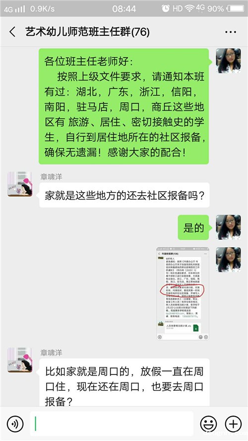 疫情发生以来,校医室在第一时间发布《关于新冠病毒疫情致家长的一封信》,对学生及家长进行身心健康安全教育,指导大家及时了解相关知识。作为学校疫情防控领导小组任命的疫情报告人,在市直校医群、疫情防控局直属学校群、顶岗实习班主任防控群、学生处疫情防控群中都有周永玲老师忙碌的身影,她时刻关注上级发布的工作安排,并及时、清楚地将工作指示传达给班主任,不厌其烦的做好沟通解释工作。她每天关注近三百名教职工、工勤人员和三千余名学生的信息上报情况,对出现的问题耐心排查督促;坚决做好各种数据的统计上报和全校的疫情防控日报告、零报告。