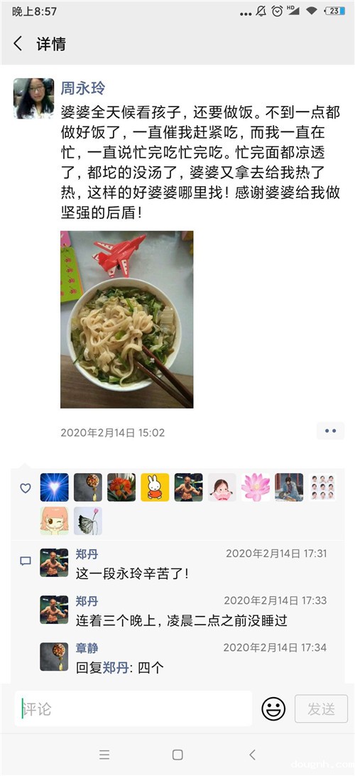 “婆婆全天候看孩子,还要做饭。不到一点饭就做好了,一直催我吃饭。而我一直在忙,一直说忙完吃忙完吃。忙完面都凉透了,婆婆又去给我热了热……”这是2月14日下午15:02周永玲老师的一条朋友圈,此时她刚刚结束当天统计各种报表的工作,刚刚顾上吃午饭。善良的她在感谢婆婆对她的照顾,而我们更多的人,却被她这种认真的工作精神而深深的感动。近一段时间,这种情况是她的工作的常态。