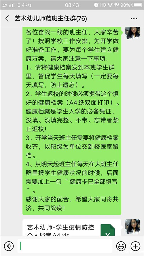对重点人群,她及时关注及追踪,逐一打电话询问。同时,她还关心着每一位师生的健康,对每一位身体有异常情况的师生都一一电话询问,并根据实际情况给予科学指导。