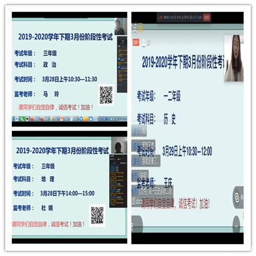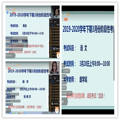 考试期间,教师需要提前10分钟进入直播间,要求小组长汇报本组成员考试准备情况,确保每一个学生都能按时参加考试。家长化身监考员,在家监督孩子的考试过程,并全程和老师保持联系。老师和家长密切配合,从线上和线下两个渠道全方位监督学生的考试。