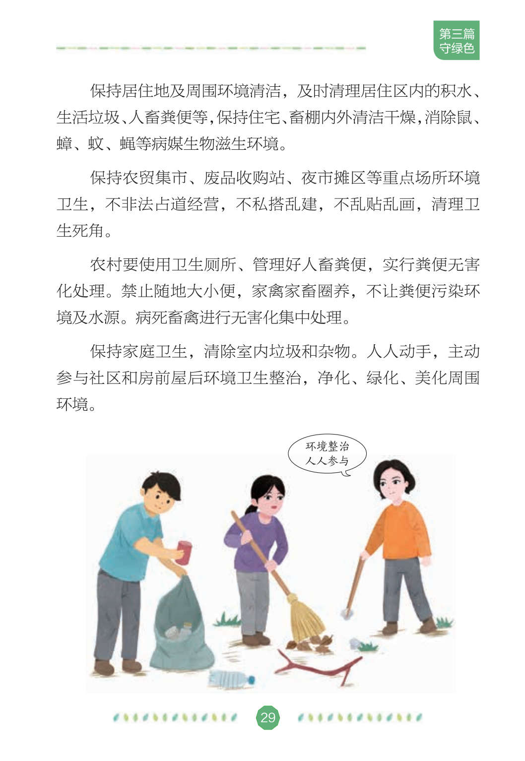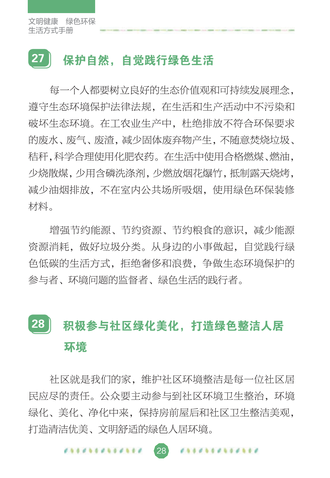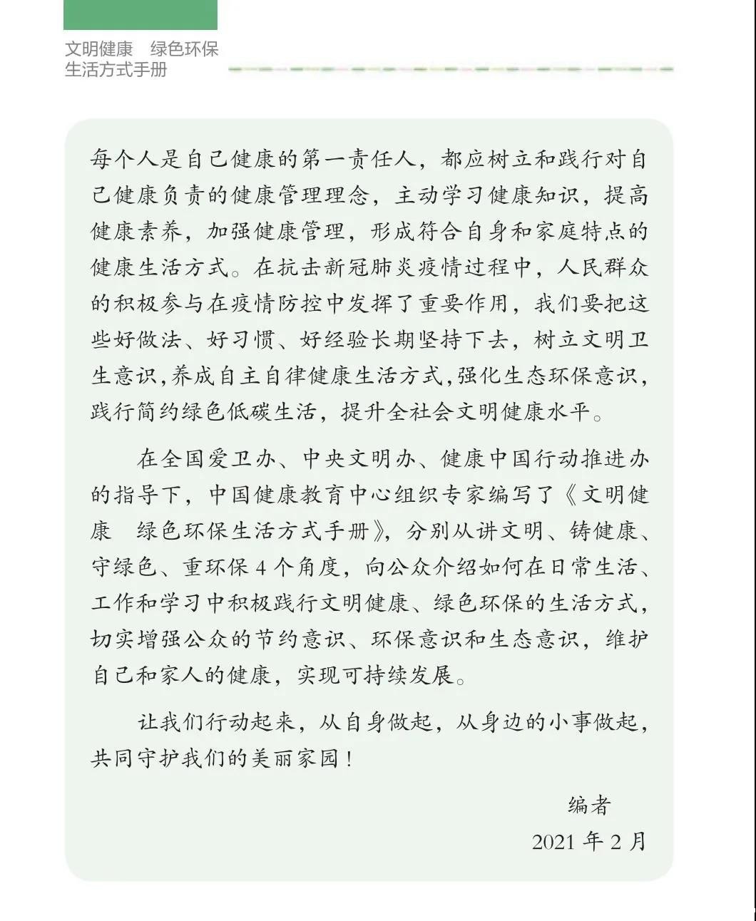2021年4月是第33个爱国卫生月主题为“文明健康,绿色环保”每个人是自己健康的第一责任人在日常生活、工作和学习中如何践行文明健康、绿色环保的生活方式呢?今天继续学习《文明健康 绿色环保生活方式手册》第三篇:守绿色自觉践行绿色低碳生活方式建设清洁美丽家园——