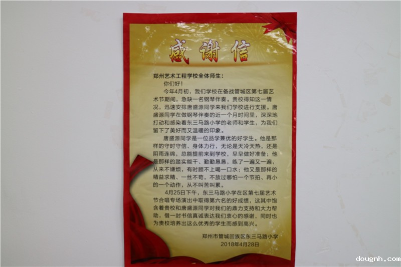 信中提到这包含着郑州市艺术工程学校和唐盛源同学对东三马路小学的鼎力支持和大力帮助,唐盛源同学为大家留下了美好而又温暖的印象。同时郑州市艺术工程学校表示希望本校培养出来的学生能够更多更好的服务社会,能够担当起特色艺术老师的角色回报社会。