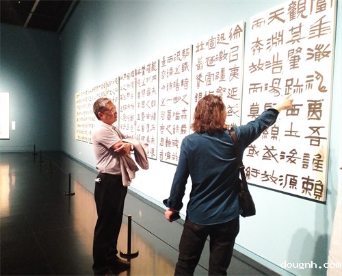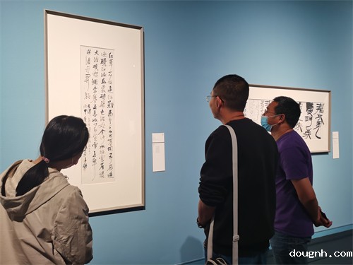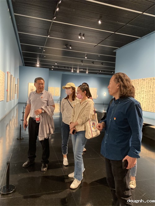 在一幅内容为毛泽东七律《长征》的书法作品面前,大家停住了脚步,听宋锟老师讲解这首诗背后红军长征的故事,感受中国共产党和中国工农红军两万五千里的艰辛和执着,从作品中深切体会共产党带领全国人民争取民族独立、建设美好家园的光辉历史和巨大成就。