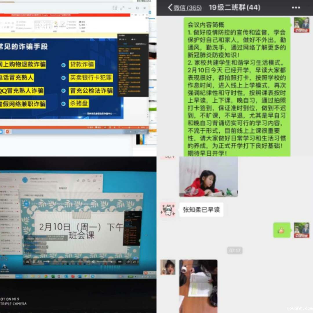自习课、班会课和课间操是学校日常教学的重要组成部分,如何保证高高效率高质量完成早读课、晚自习、班会课和课间操,提高同学们的自觉性和自律性?班主任们各出神招,引导家长高度重视。早晚自习课,班主任随机抽查学生,让家长发送学生自习情况到班级群,确保学生实时在线学习。课间操以多班联播的形式进行,学生们集体学做眼保健操、八段锦和戏曲广播操,班主任跟班抽查,家长实时监督。班主任利用钉钉直播平台,在线召开班会,向学生宣传疫情防控知识,普及防诈骗方法。