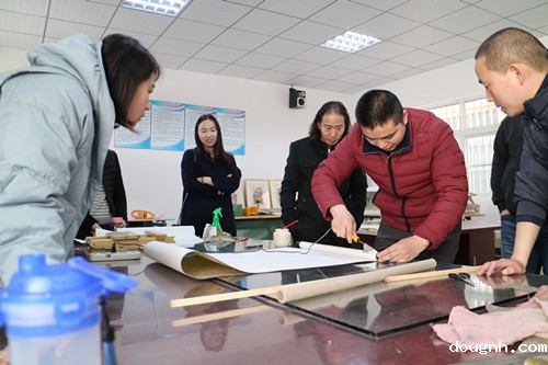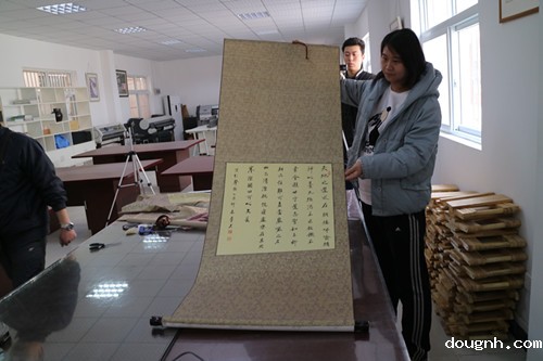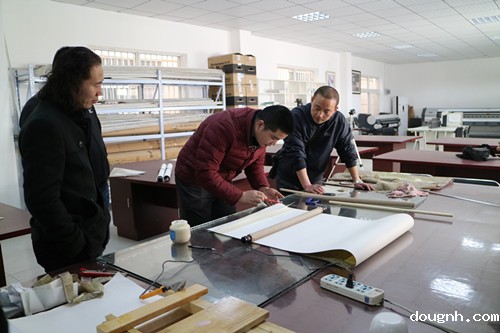 5月13日上午,我校聘请装裱实训专家张辉来到郑州市艺术工程学校装裱实训教室给我校艺术设计专业实训指导教师做了一堂生动的实训指导示范课。张老师将书画装裱艺术的整个过程展示出来,对一幅书画托心—方心—下料—镶活—齐边—包边—折叠串口—腹背—下墙—砑光—上杆—栓条与系带,每一个步骤老师都认真示范,老师们看的也很投入,学校专业老师也纷纷来到实训室进行学习和提高,在实际操作过程中,将最初的字画装裱成型。