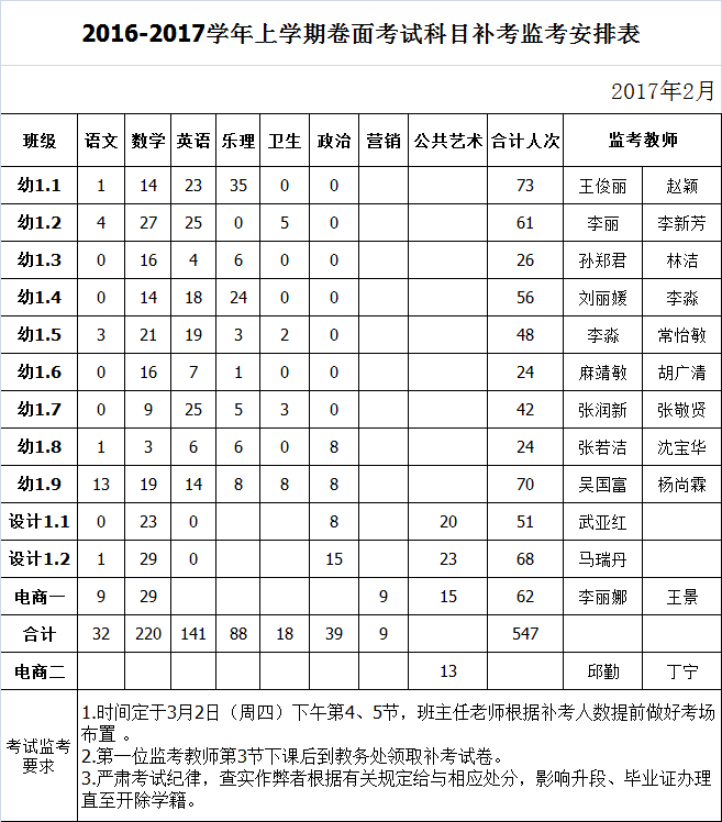2016-2017学年上学期卷面考试科目补考监考安排表