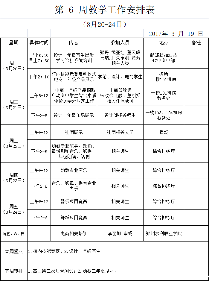 第 6 周(3月20-24日)教学工作安排表