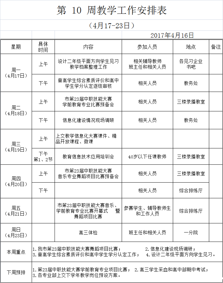 第 10 周(4月17-23日)教学工作安排表