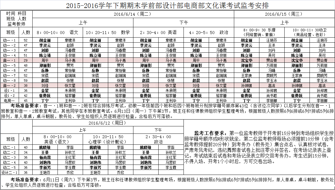 2015-2016学年下期期末学前部设计部电商部文化课考试监考安排