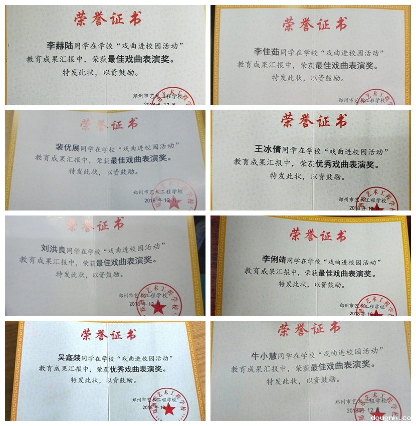 手捧鲜红的证书,获奖学生柴子珺同学说“自己通过在戏曲纸艺服饰社团的演出和体验实践,切身感受到了戏曲的魅力和博大精深,从我穿的旦角纸服装的戏曲服饰中,感受到了戏曲中不同行当对服饰穿戴的要求,就从旦角来说、有正旦、花旦、花衫、青衣、刀马旦、武旦、老旦等,他们服饰一定按照角色穿戴,不能有半点的差错,戏曲中有句俗话说‘宁可穿破不能穿错’,这让我学到了戏曲程式化的特点,通过这一年在戏曲纸艺服饰社团的学习,自己增见识长知识,亲身感受到了我们民族优秀戏曲文化的魅力,我将继续通过在戏曲中的学习,陶冶自己的审美情操”。