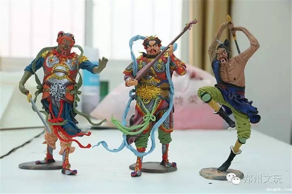 崔老师在校教美术专业及高中基础课,也同时是河南省美术家协会会员,他以循循善诱的授课方式,温和可亲的面容,得到了所有家长和学生的认可。每一个人第一眼见到崔勇锐老师的时候,都几乎不敢相信这么文质彬彬的小伙子竟能做出神话一样的作品,在崔老师的作品里,有威风凛凛的四大天王,也有忠义千古的关云长,有形若鬼魅的钟馗,也有憨态可掬的弥勒佛,这些作品线条张力十足,夸张的神态透射出了神圣与威严,大气而凝重,这些作品无一例外的体现了“创新”,崔老师在原有的面塑基础上进行了许多改进,将中国画的线描基础的传统技法融入面塑,并从基础面团制作到颜料的混合的每一个细节入手,甚至对使用工具都进行了改良,这一切的革新和改变,都在创作者执着与深爱中得到了升华,他的创作仿佛给人物赋予了新的灵魂和生命,让每一个书中的人物栩栩如生的出现在我们的视野。