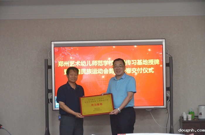 6月20日下午,郑州文化馆非遗中心主任赵利涛、副主任马静、“听爷爷讲故事.非遗援助计划”发起人.市非遗中心副主任马守国、“剪纸花.民族情”组委会成员及郑州市非遗剪纸传承人杨征和文化馆志愿者一行来到18新利app,他们是受中华人民共和国第十一届少数民族传统体育运动会执委会的委托,向18新利app颁发传统文化进校园“非遗传习基地”牌匾以及我校承接“剪纸花.民族情”向全国民运会献礼的剪纸长卷项目的交付工作的。