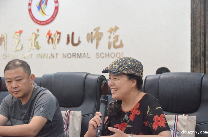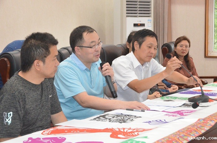冯春霞老师向领导专家介绍剪纸的构图思路和制作情况