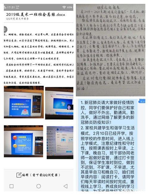 学校领导班子高度重视,校党委书记、校长宋志强在防疫工作群中推送省教育厅公众号发布的关于防电信诈骗的提醒。学生处主任郑丹通过钉钉班主任群召开全体班主任会,对本次班会的目的、任务和工作方法做了详细的指导。学生处资助专员搜集了防诈骗的课件并推送到班主任群,配合班主任开展教育工作。